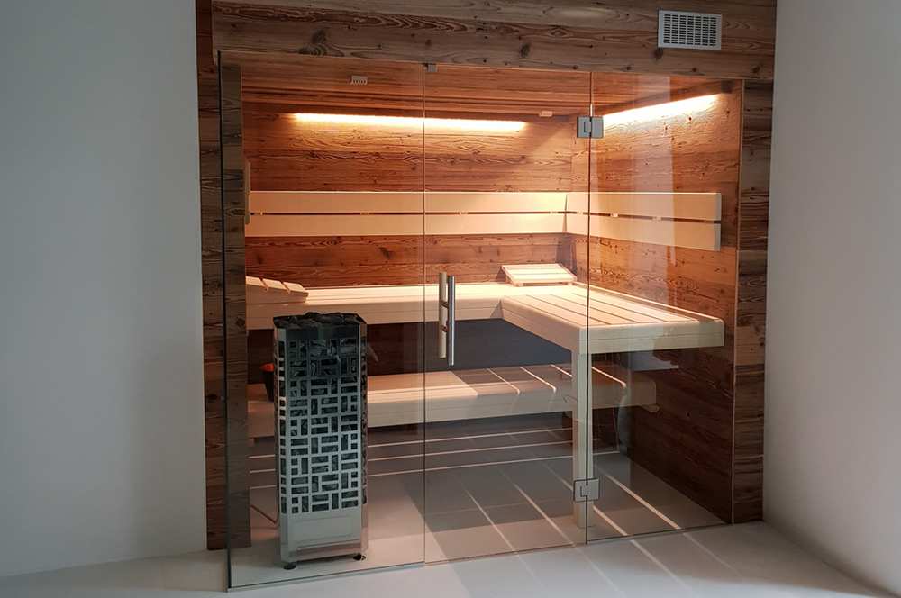 Vielseitiger Stand oder Höngesaunaofen auch mit integriertem Verdampfer für private Saunakabinen.