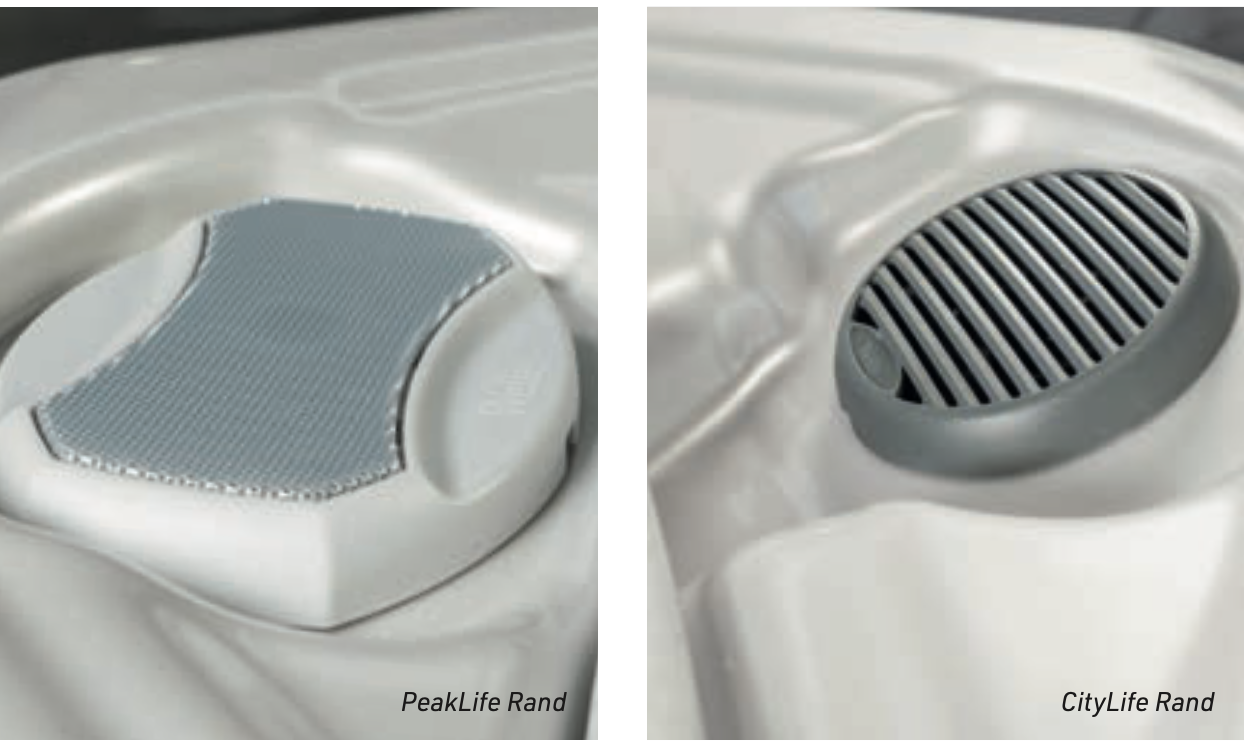 Holzähnliche, breite horizontale Seiten- und Eckleisten. Diese Elemente verleihen dem Erscheinungsbild der Spa´s eine intime Atmosphäre. Die Schürzen sind in den Farben grau und braun erhältlich. Außerdem versetzt uns der futuristische Look unserer neuen Whirlpool Seitenverkleidung sofort in die Zukunft. An der Seite der Whirlpool Abdeckung verläuft eine LED-Leiste (nur PeakLife). Die neu entwickelten Eckelemente verleihen unserer neuen Whirlpool Serie ein moderneres und futuristischeres Aussehen.