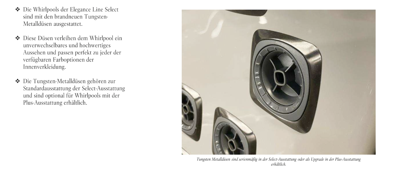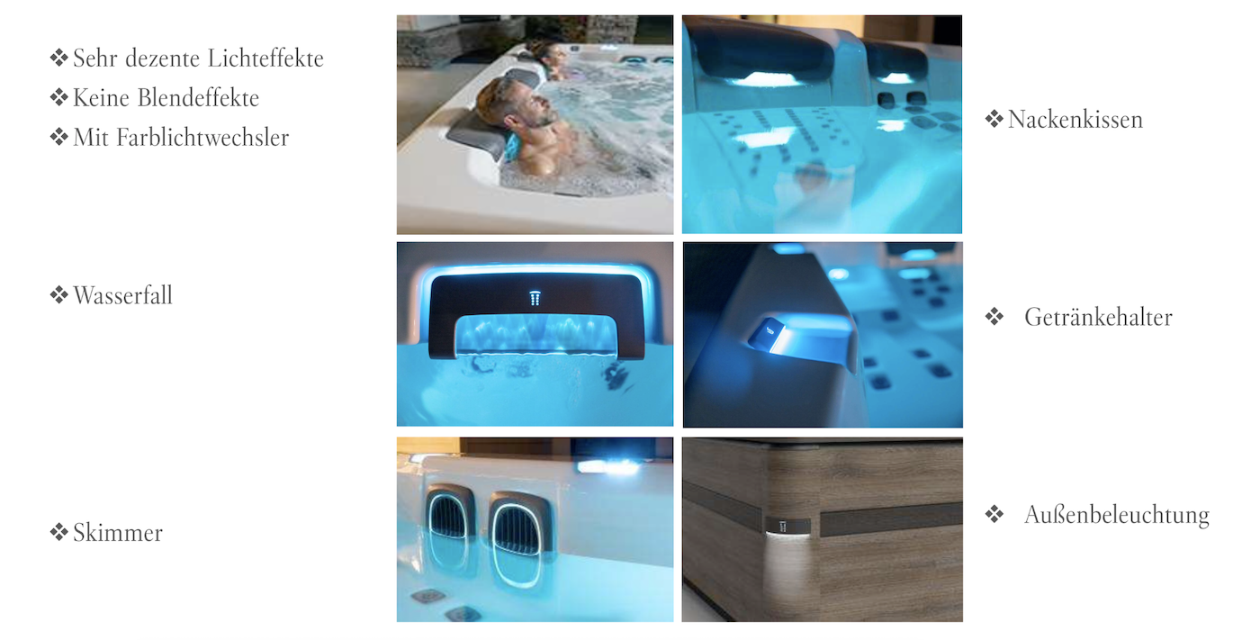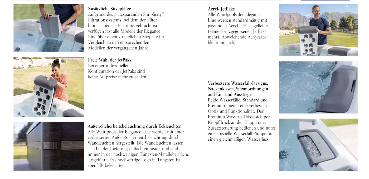 Das neue Design und die zeitlosen Farben verleihen den komfortablen Spas ein ausgesprochen edles Aussehen. Die Select Edition bietet zudem ein hochwertiges Ausstattungspaket: Ein standardmäßig integrierter Ozonator, ein digital gesteuerter Wasserfall mit Hintergrundbeleuchtung, praktischen beleuchteten Getränkehaltern, sowie dem Touch Control Bedienfeld und Zusatzbedienfeld.