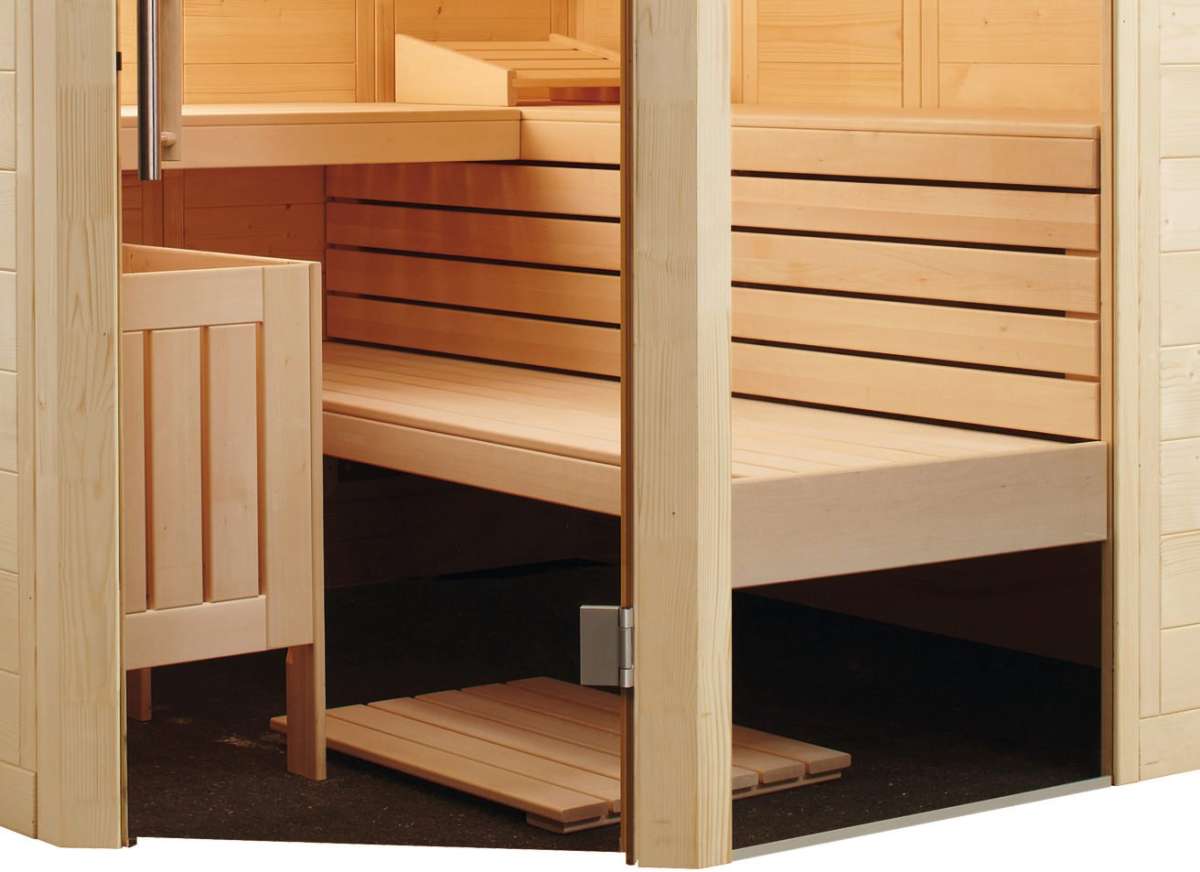 Fichtenholz verleiht der Sauna eine klassische, warme Ausstrahlung und bildet die perfekte Grundlage für viele Jahre entspannter Saunagänge.