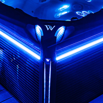 Neue Wellis PeakLife Whirlpool-Beleuchtungsdüsen. Bei den Whirlpools der PeakLife Premium Edition, die es nur bei Wellis gibt, leuchtet auch der Rand der Düsen und bietet so einen beeindruckenden Anblick. Wellis hat zahlreiche Patente für seine neuen Modelle, eines davon sind die außergewöhnlichen Lichtdüsen. Die Strahlen beleuchten nicht nur sich selbst, sondern auch die umliegende Oberfläche. Das Innere des Whirlpools ist moderner dadurch, sein futuristisches Design verleiht ihm das einzigartige Aussehen eines Raumschiffes, welches es auf dem Whirlpoolmarkt bisher noch nicht gab. So erscheint der Whirlpool moderner und beeindruckt mit einer optisch größeren Wasseroberfläche.